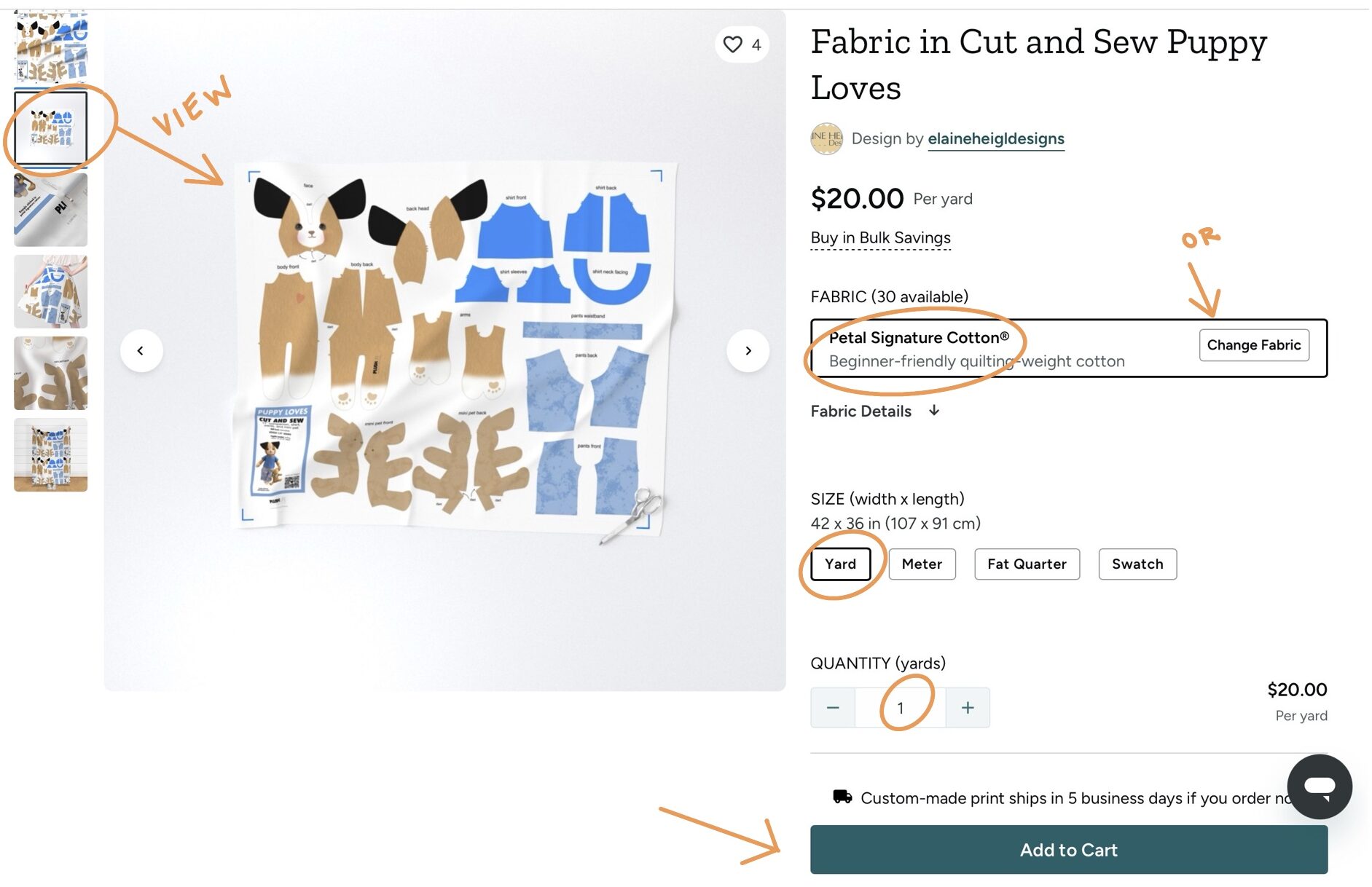 Once your fabric type and panel size are set, add your panel to the cart and complete your order on Spoonflower. Your custom-printed fabric will be made just for you and shipped directly to your door.